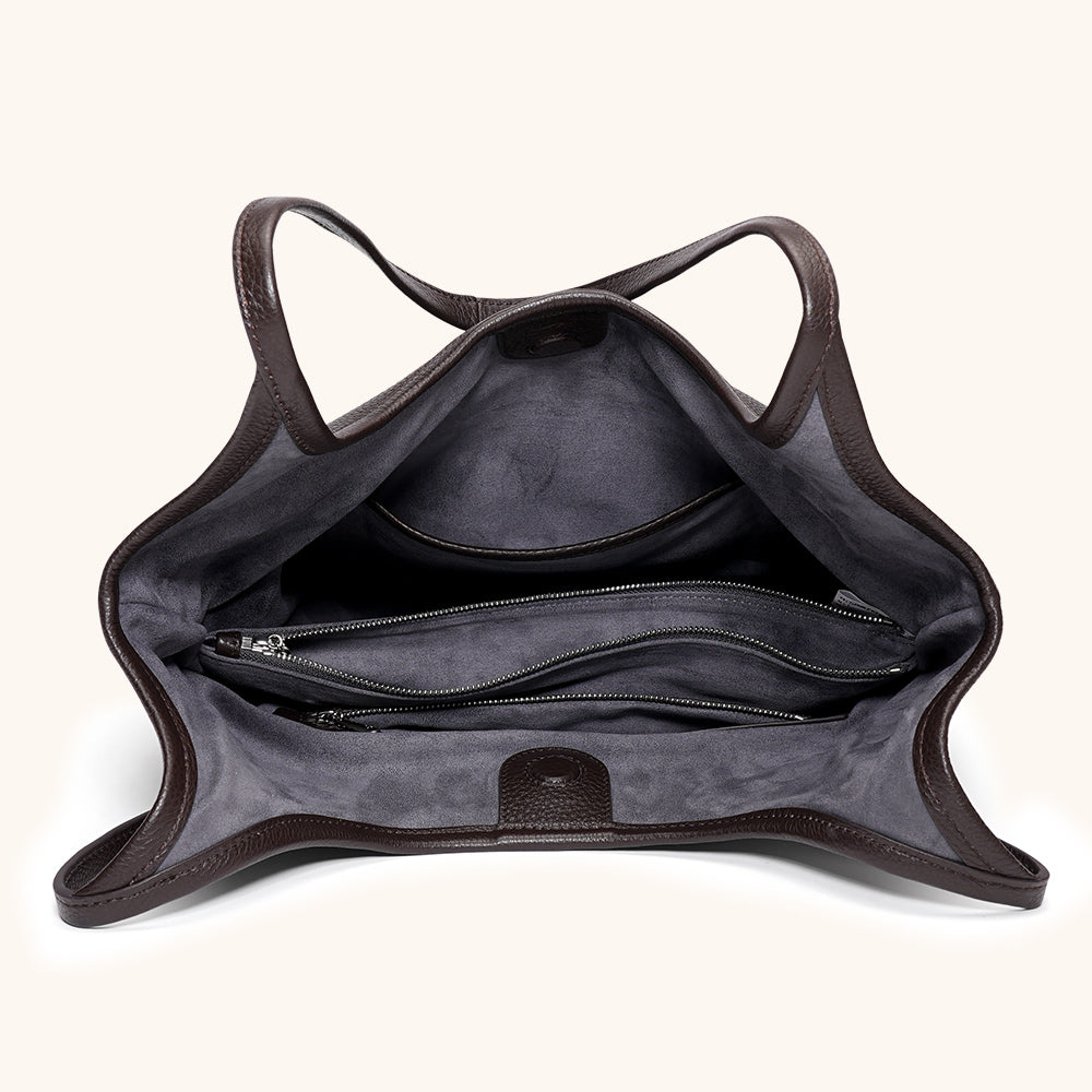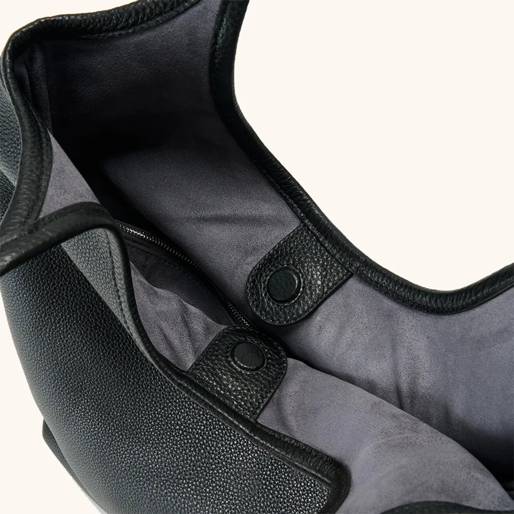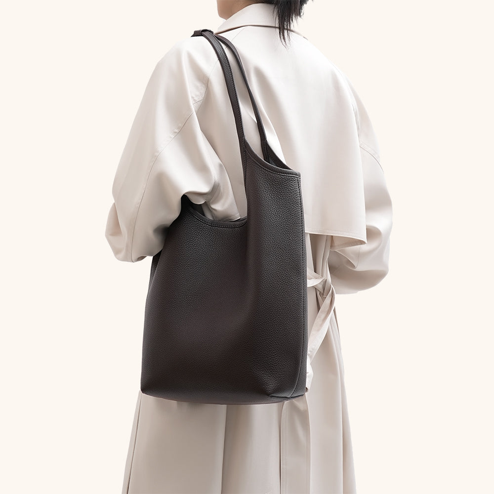 Crafted from full-grain calf leather with a pebbled texture, the bag feels soft yet resilient. Its matte surface gradually develops a natural sheen over time, highlighting the leather’s depth and character.