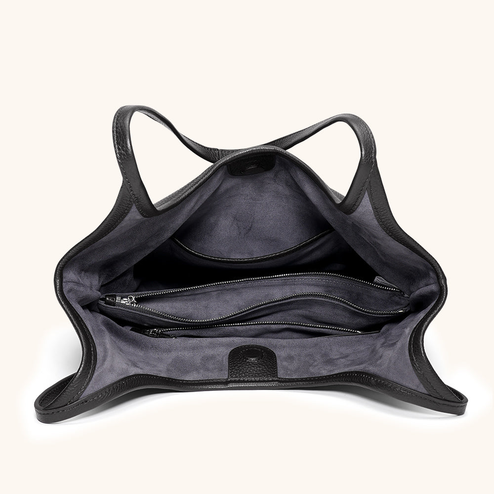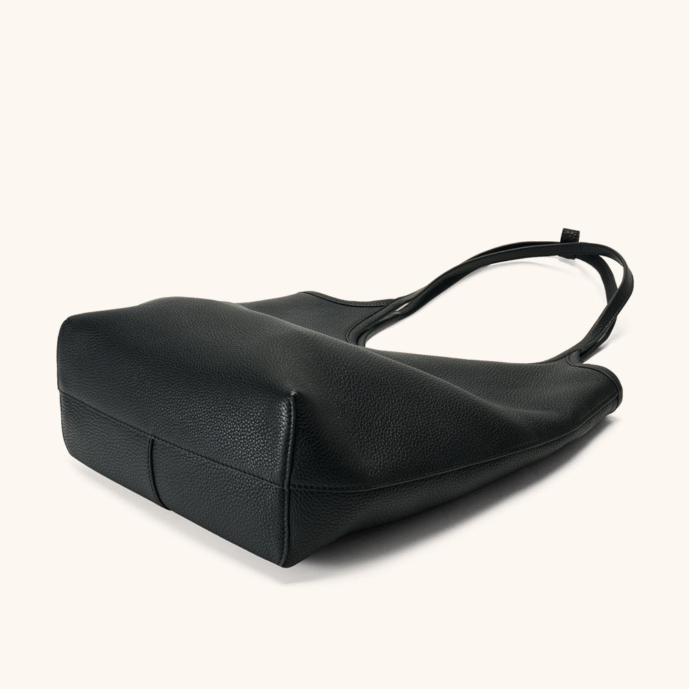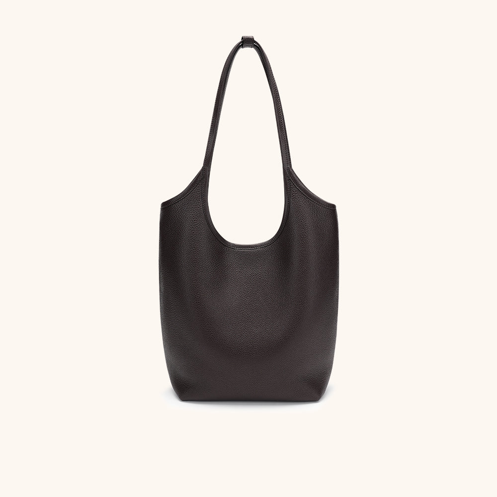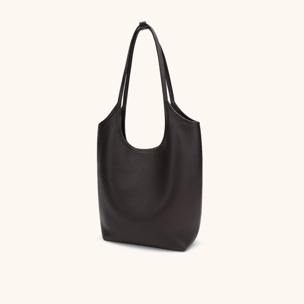 Crafted from full-grain calf leather with a pebbled texture, the bag feels soft yet resilient. Its matte surface gradually develops a natural sheen over time, highlighting the leather’s depth and character.