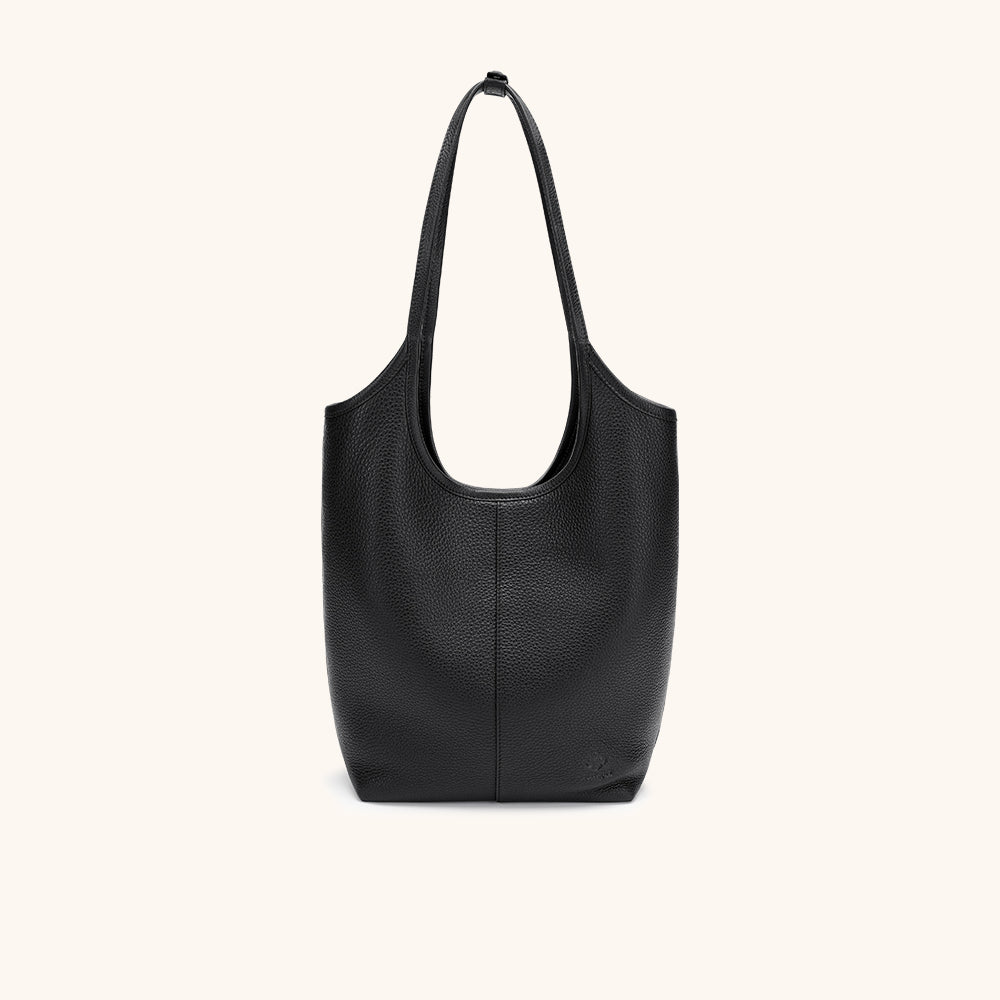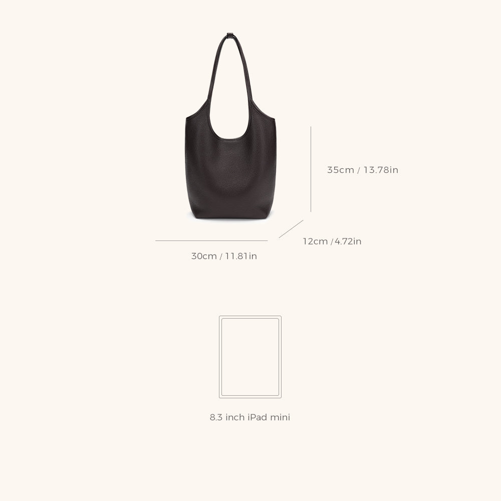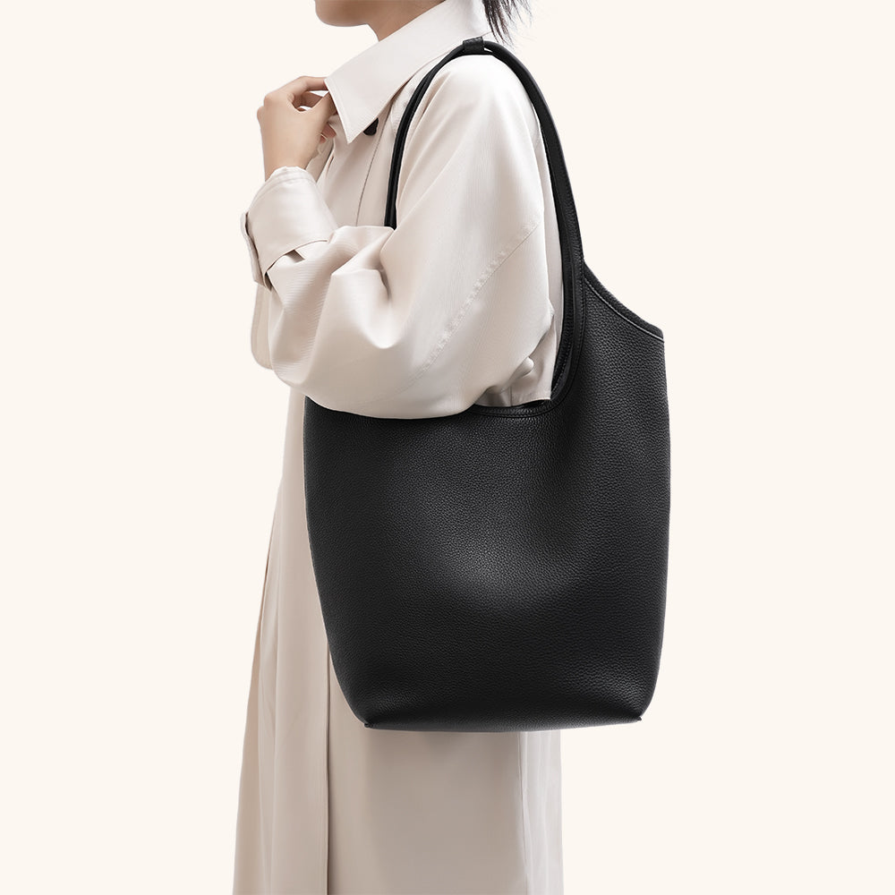 The classic bucket shape features a curved opening that gently follows the body’s lines, creating an elegant silhouette when worn. The bag has two handles that can be fastened together with a handle connector for a steady grip, and the shoulder strap widens gradually from the opening to the top, allowing it to rest comfortably and naturally on the shoulder.