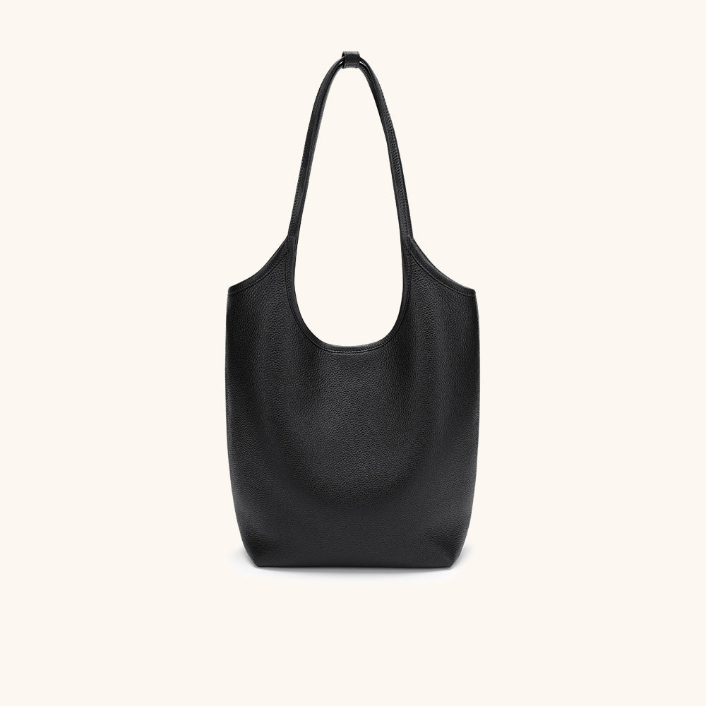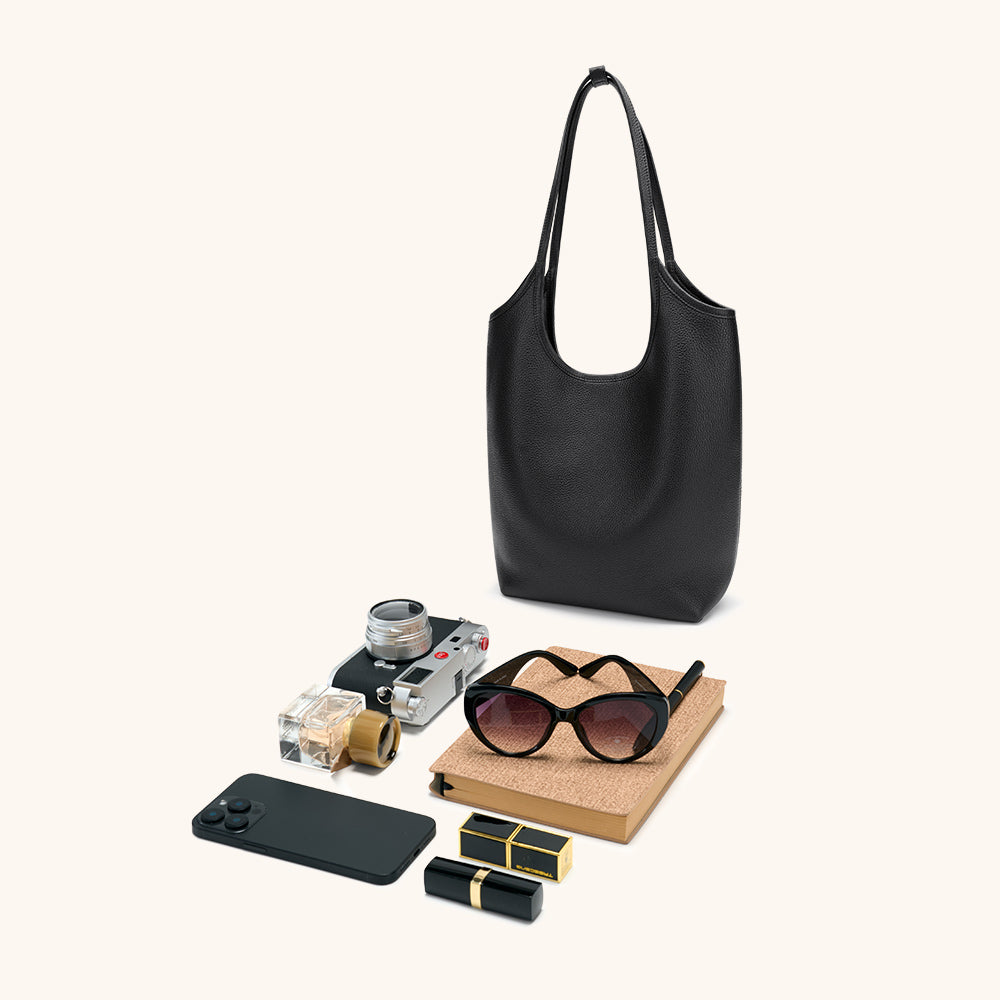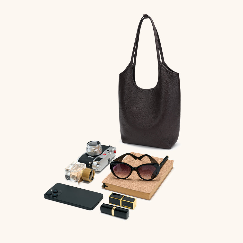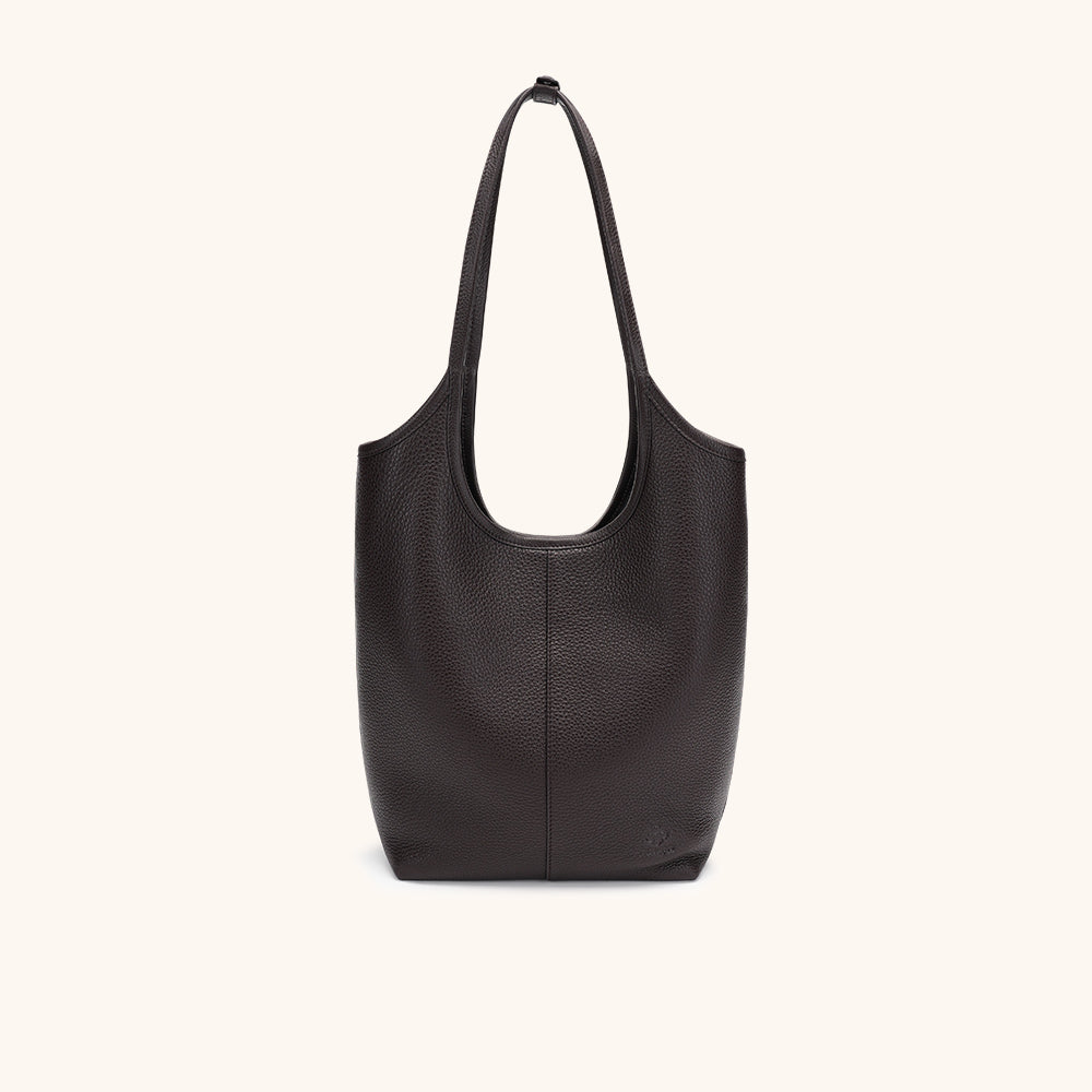 The classic bucket shape features a curved opening that gently follows the body’s lines, creating an elegant silhouette when worn. The bag has two handles that can be fastened together with a handle connector for a steady grip, and the shoulder strap widens gradually from the opening to the top, allowing it to rest comfortably and naturally on the shoulder.
