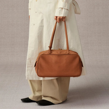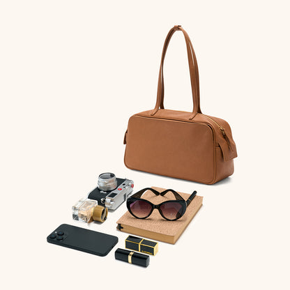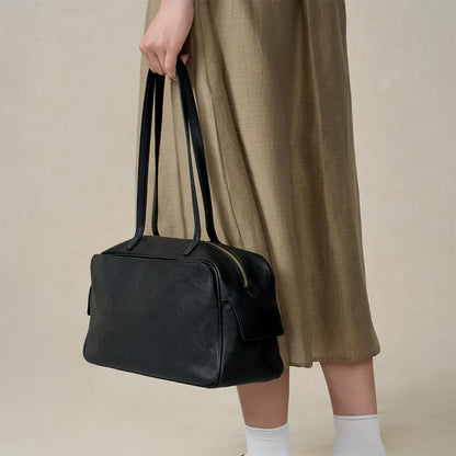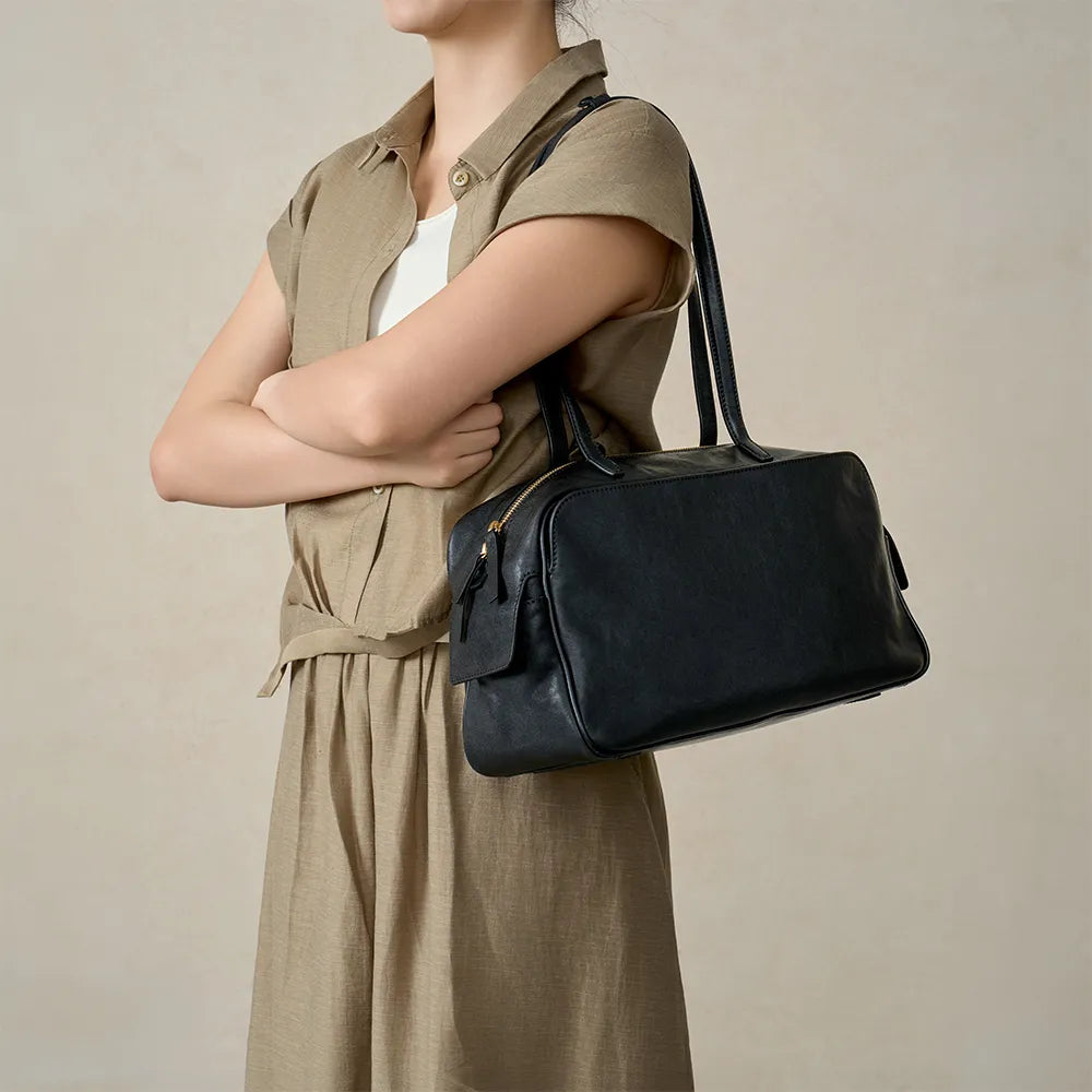 The front has a magnetic slip pocket for quick access, while two magnetic side pockets offer extra space for small essentials. A two-way zipper opens smoothly from both sides and is built for long-lasting use. Dual top handles come with a detachable connector that can link them together, making it easier to carry by hand and preventing them from slipping off the shoulder. A reinforced leather base with two protective pads keeps the bag sturdy for everyday wear.