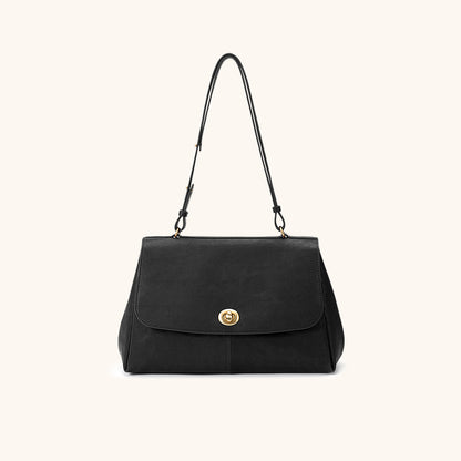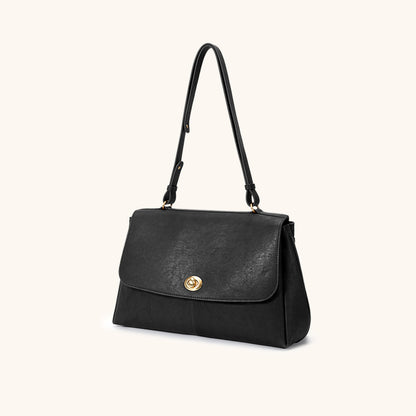 The main flap opens with a rotary lock, while a back pocket with a magnetic closure provides easy and secure access to essentials.