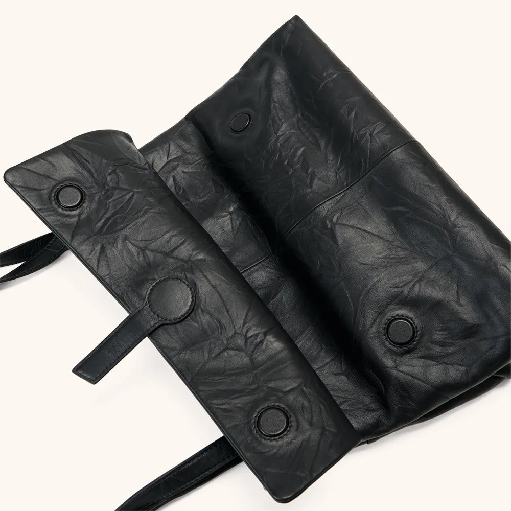 The flap closes with two magnetic snaps for easy access, and the drawstring shoulder strap can be worn crossbody or over the shoulder, featuring a widened section for added comfort. The bag also features a reinforced, thickened bottom with two leather pads for added durability.